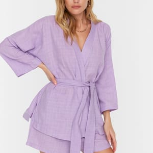 Trendyol 4918574% OFFFlare Sleeve Belted Kimono is a popular piece of clothing among women. The material of the product is 100% Viscose Model Measurements: Height: 1.76, Bust: 84 Waist: 60, Hips: 89 Size Worn By Model: S/36/2 Hand wash in warm soapy water after each use. Do not use bleach and detergent.